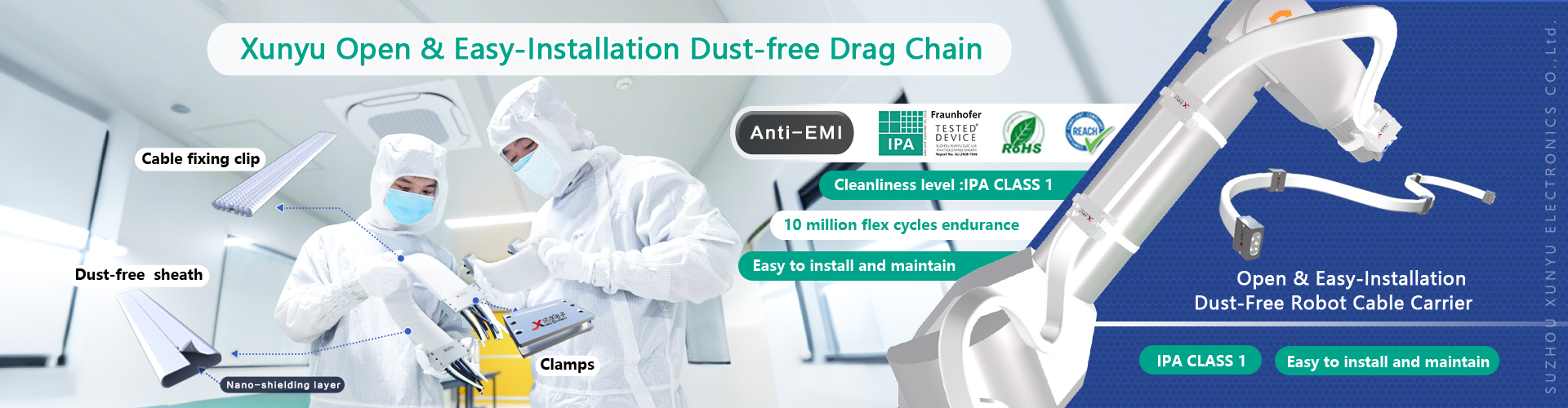 Suzhou Xunyu Electronics Co., Ltd. boasts over 20 years of experience in the wiring harness and cable industry, specializing in the R&D and production of highly flexible and quiet Dust-free Drag Chain (1st generation dust-free cable carriers), open and easy-to-install Dust-free Drag Chain (2nd generation dust-free cable carriers), shielded open and easy-to-install Dust-free Drag Chain (3rd generation Dust-free Drag Chain), clean and highly flexible motion ribbon cables, vacuum cables, clean motion cables, highly flexible motion cables, and wiring harnesses. The company provides comprehensive one-stop integration services for all its products. The performance, reliability, stability, service life, and other metrics of the company's products have reached high standards within the industry.